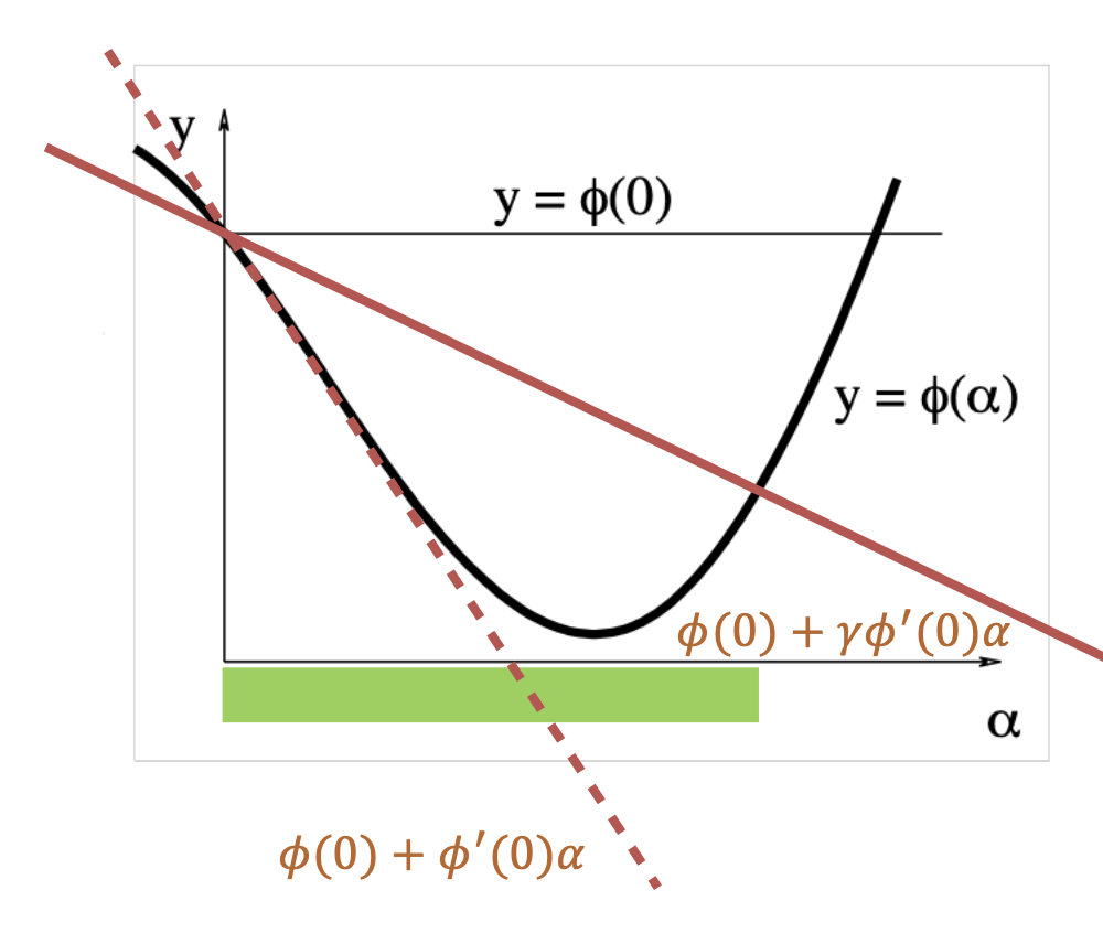 - \(\alpha\) 太大,\(\varphi(\alpha) > \varphi(0)\) -> 减小 \(\alpha\)