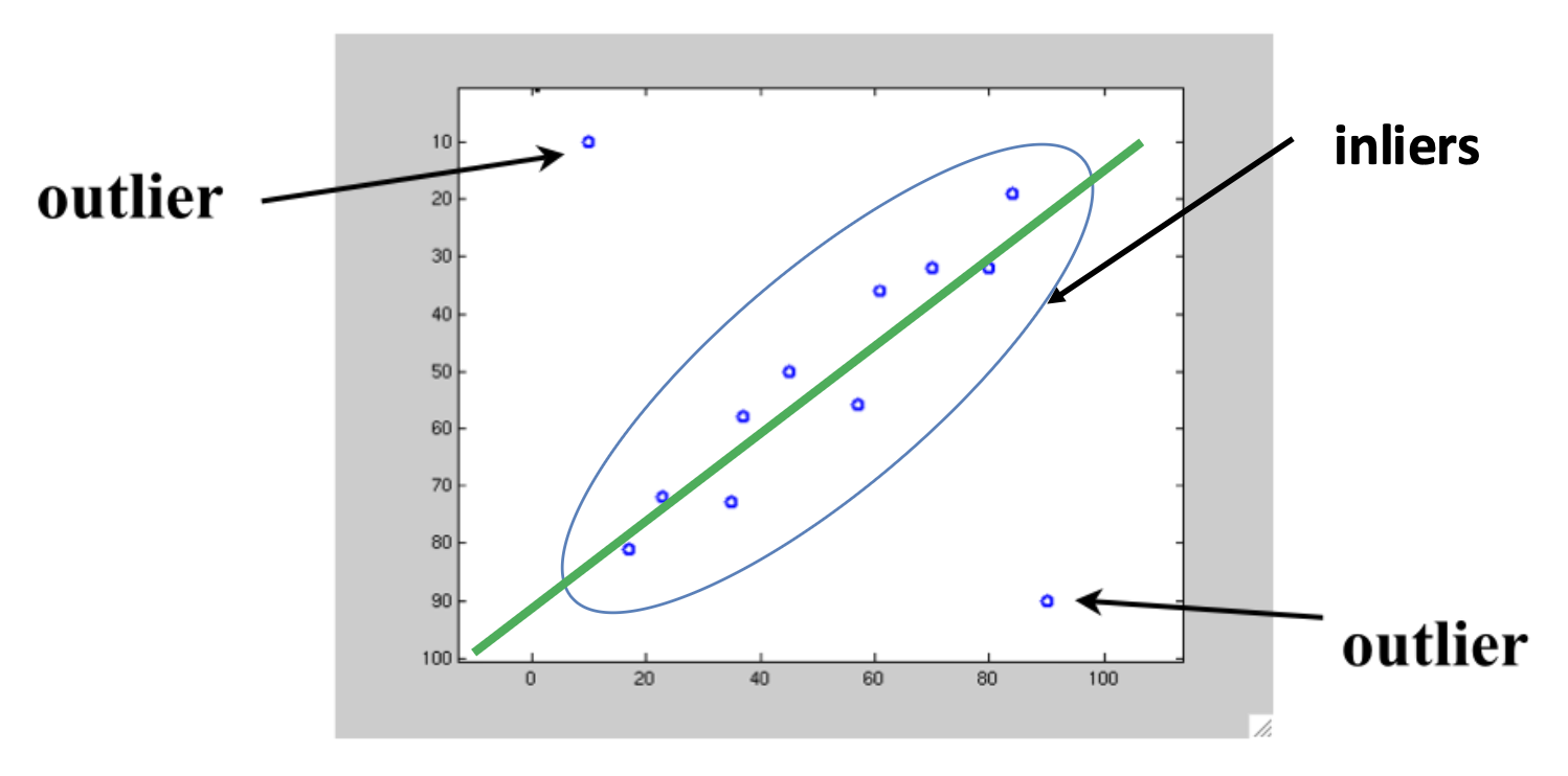- 内点(inlier):遵循模型假设的数据点