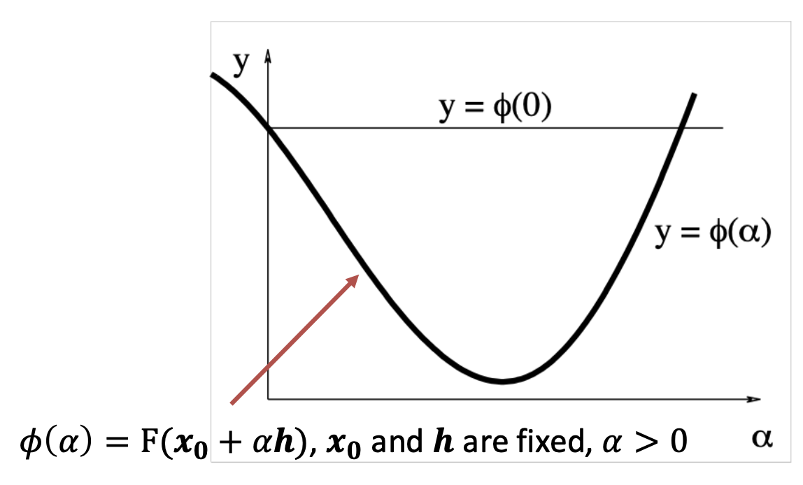 - 减小 \(\alpha\),直到 \(\phi(\alpha)\leq\phi(0)+\gamma\phi^{\prime}(0)\alpha\)