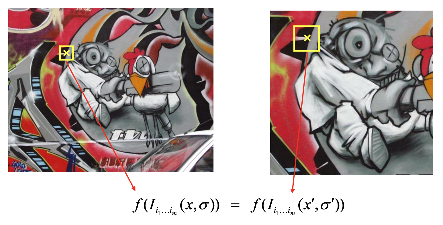 对于上面例子的结果,如何确保这些点是可重复的(repeatable)?如何从数学层面定义这个可重复性?我们希望对应像素上的响应值在图像变换 (image transformation) 的过程中保持不变(invariant)。