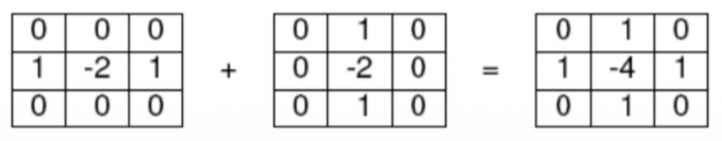 \[ \begin{aligned}&\frac{\partial^{2}f}{\partial x^{2}}=&&f\left(x+1\right)+f\left(x-1\right)-2f\left(x\right)\quad\to\quad\begin{bmatrix}1&-2&1\end{bmatrix} \quad (\text{x kernel}) \\&\frac{\partial^{2}f}{\partial y^{2}}=&&f\left(y+1\right)+f\left(y-1\right)-2f\left(y\right)\quad\to\quad\begin{bmatrix}1\\-2\\1\end{bmatrix} \quad (\text{y kernel})\end{aligned} \] -