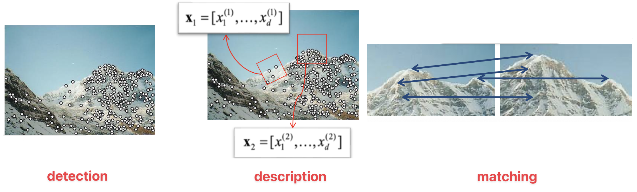 - 描述(description):围绕每个兴趣点,提取向量特征描述符 (descriptor)