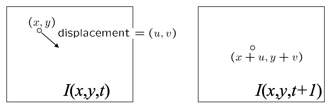 \[ \begin{aligned} I(x + u, y + v, t + 1) \approx I(x, y, t) + I_x \cdot u + I_y \cdot v + I_t \\ I(x + u, y + v, t + 1) - I(x, y, t) = I_x \cdot u + I_y \cdot v + I_t \\ I_x \cdot u + I_y \cdot v + I_t \approx 0 \quad \rightarrow \quad \nabla I \cdot \begin{bmatrix}u & v\end{bmatrix}^T + I_t = 0 \end{aligned} \] -