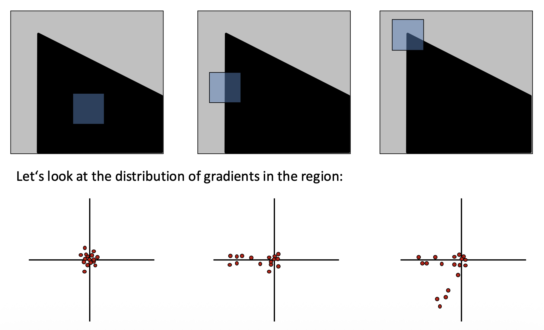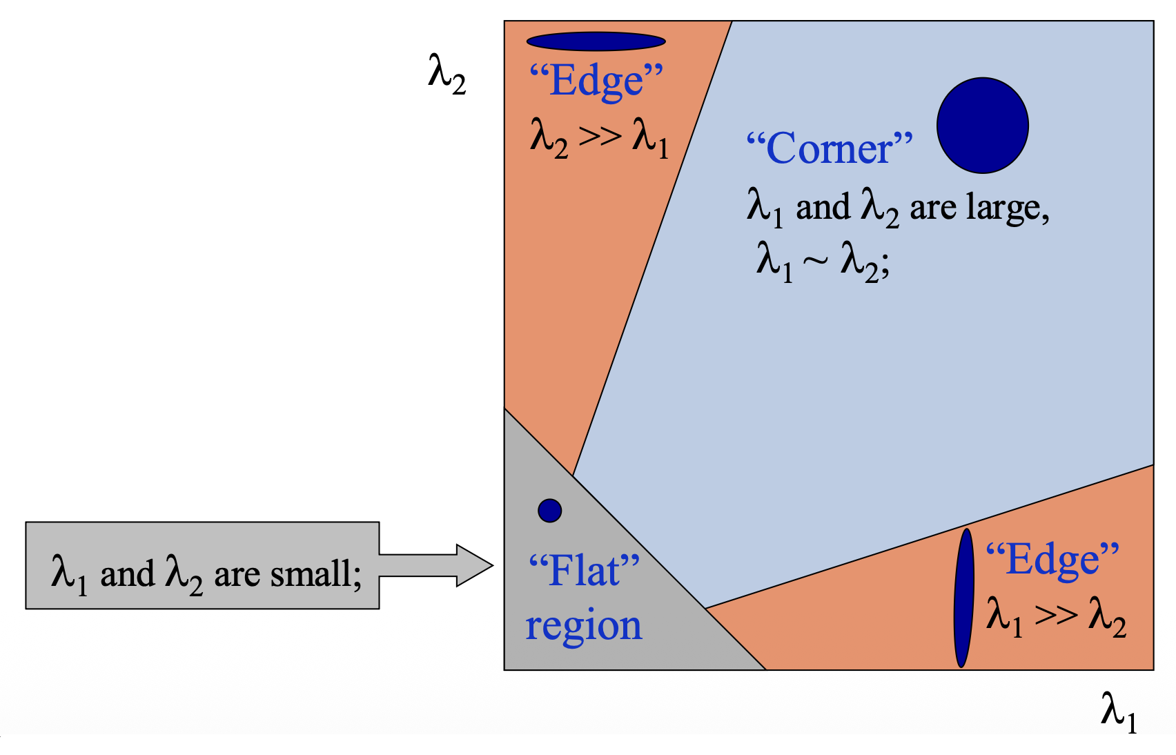 - 平滑(flat) 区域:沿任意方向都不会改变