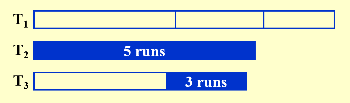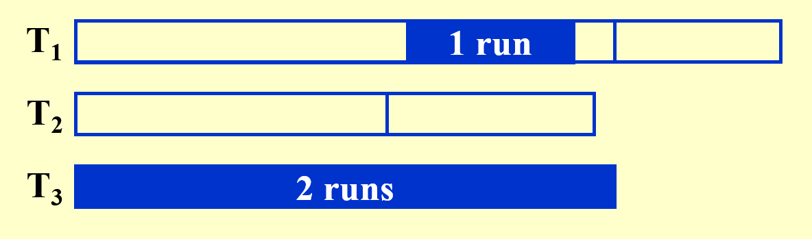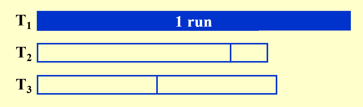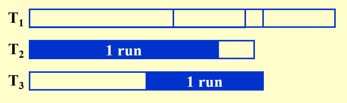 - 我们貌似还忽略了一个问题,输入缓存读取子序列的记录块也要时间,所以如果输入缓存的记录都排完后,那么就要到子序列读取新的记录块,这个过程也需要一定的时间,那么排序过程就又一次中断了。