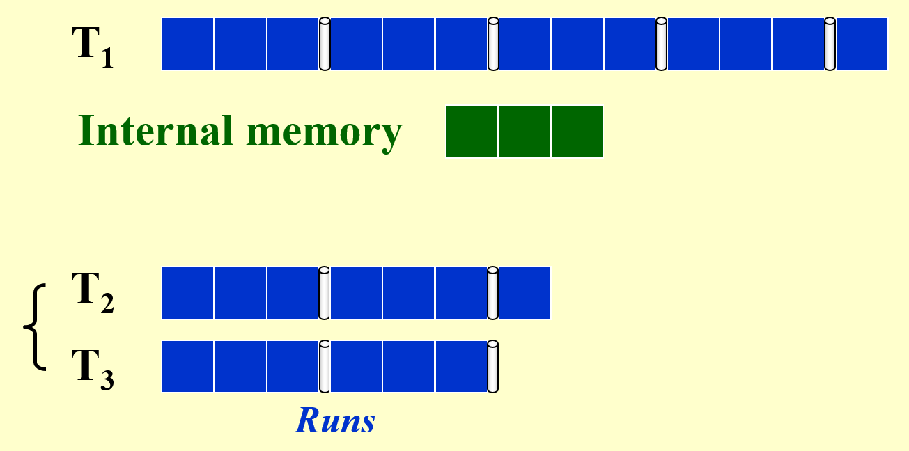- 在主存中排好序的一组数据块称为顺串(run)