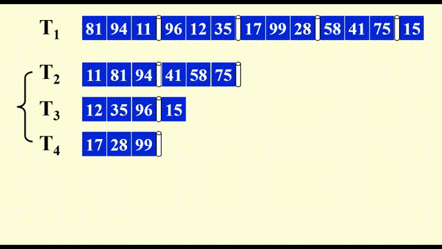 - 至少需要使用 3 个磁带(2 个子序列合并成 1 个更大的序列)