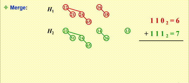 - 合并得到的新的二项树可能会被再次合并(进位)