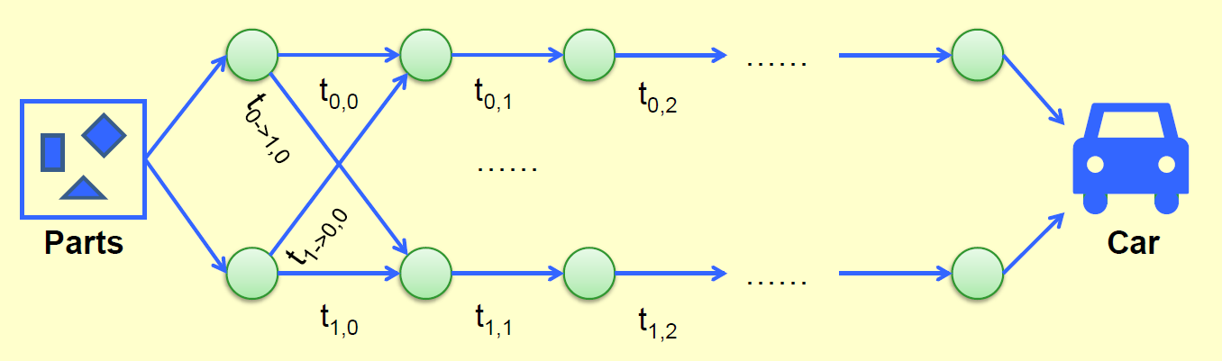 - 可以看到,在stage阶段时,我们有两种到达对应点的路径:要么来自第一条组装线,要么来自第二条组装线