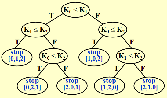 排序 N 个元素会产生 N! 中不同的可能情况,因此决策树至少有 N! 个叶子节点。若树的高为 k,那么 \(N! \le 2^{k-1}\),所以 \(k \ge \log(N!) + 1\)