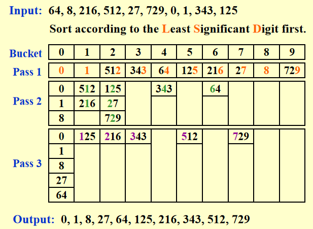 每一趟后的顺序按从左往右、从上往下的方向读取,比如 Pass 2 后的顺序为:0, 1, 8, 512, 216, 125, 27, 729, 343, 64