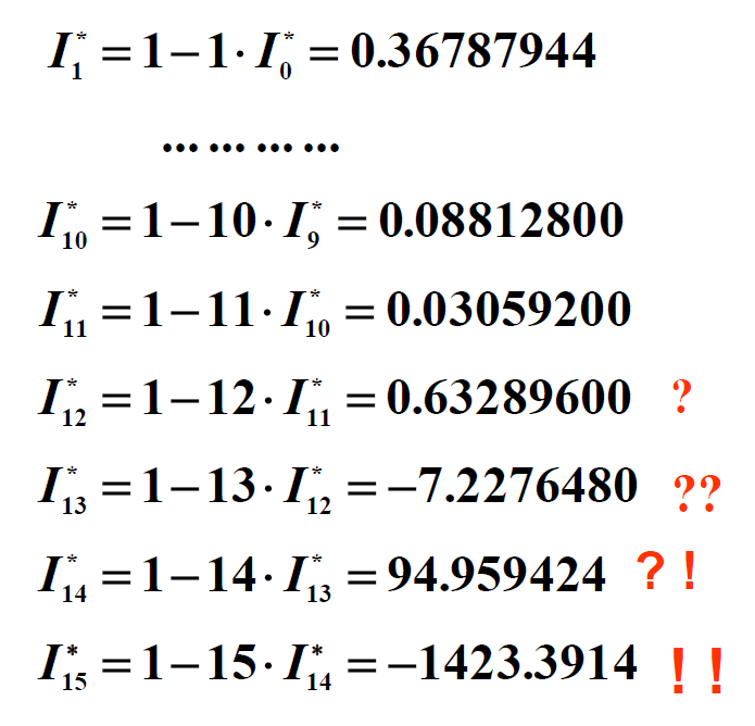 绝对误差 \(|E_n| = |I_n - I_n^*| = |(1 - nI_{n-1}) - (1 - nI_{n-1}^*)| = n|E_{n-1}| = \dots = n!|E_0|\),所以误差是以阶乘速度增长的,比指数级别的增长还要快得多!