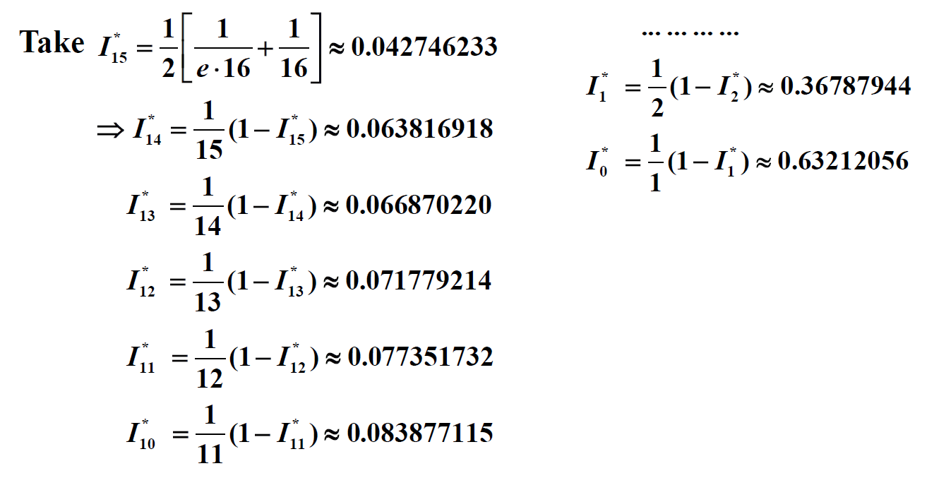 这种转换之所以可行,是因为 \(|E_{n-1}| = \Big| \dfrac{1}{n} (1 - I_n) - \dfrac{1}{n} (1 - I_n^*) \Big| = \dfrac{1}{n}|E_n|\),从而 \(|E_n| = \dfrac{1}{N(N-1)\dots(n+1)} |E_N|\),也就是说即使当 \(n\) 变得很大,误差还是很小,是稳定的误差