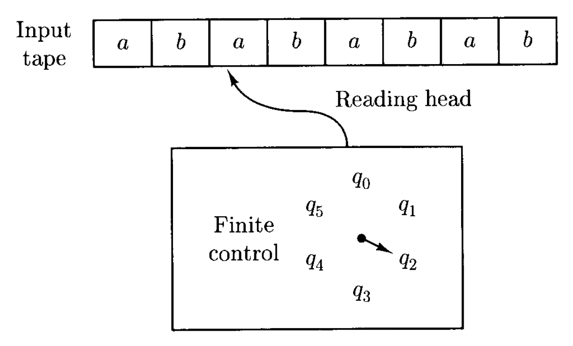 - 每隔固定的一段时间,自动机从输入带上读取一个符号,随后根据当前状态及所读符号进入新状态,读完后读头会向右移动一格