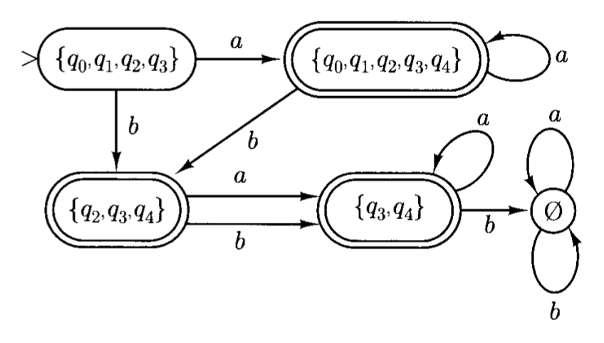 - \(M^{\prime}\) 的终态集合 \(F^{\prime}\) 将由 \(K\) 的所有包含至少一个 \(M\) 的终态的子集组成