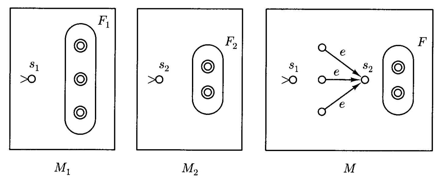 - 形式上,若 \(w \in Sigma^*\),那么 \((s, w) \vdash_M^* (q, e)\ (q \in F)\) 当且仅当 \((s_1, w) \vdash_{M_1}^* (q, e)\ (q \in F_1)\) 或 \((s_2, w) \vdash_{M_2}^* (q, e)\ (q \in F_2)\) 成立