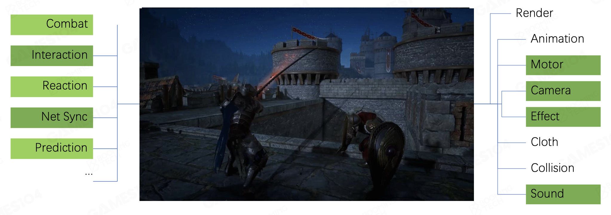对于以下一个简单的两人联机动作游戏,也要考虑诸多的系统,比如渲染系统、动画系统、控制系统,以及网络相关的部件等