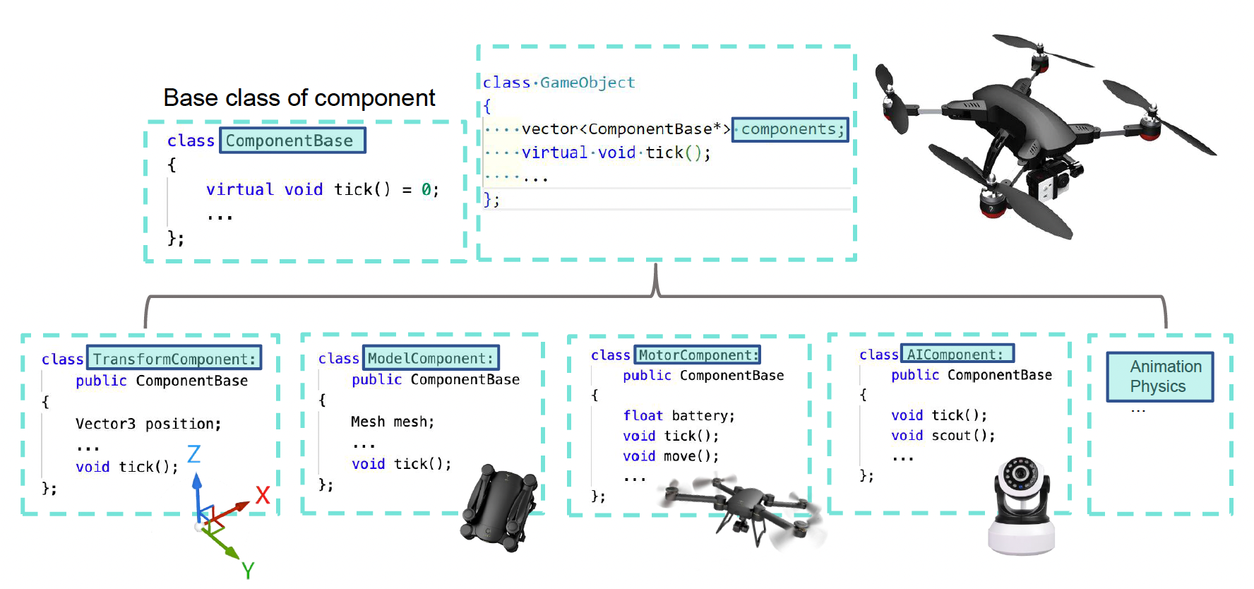 对于前面无人机的例子,我们可以把它拆分为诸如模型、马达 (motor)、AI 等部件。