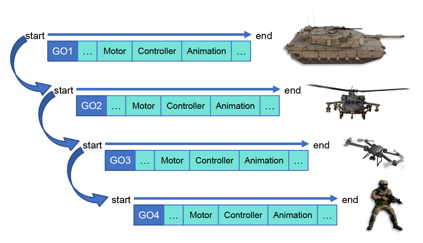 但在现代游戏引擎中,我们采用的不是这种思路,而会用一种基于组件的 tick,依次 tick 每个组件。比如先 tick 完所有 GO 的马达系统,然后再去 tick 所有 GO 的控制器,以此类推。