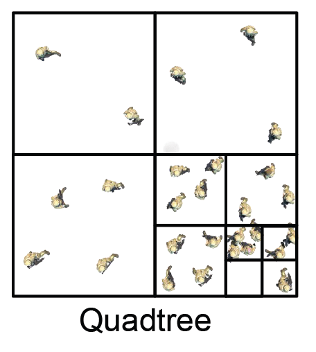 - 四叉树(quadtree):将空间划分成四块,不断划分,直至空间内对象足够少