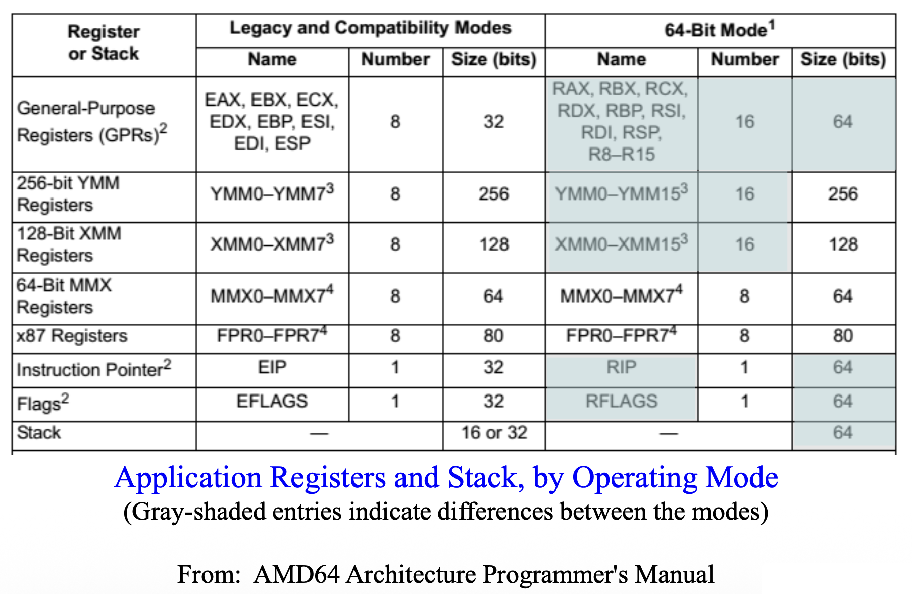 特殊目的寄存器(special-purpose registers) 包括:RIP, RSP, RFLAGS,以及段寄存器 CS, DS, ES, SS, FS 和 GS。