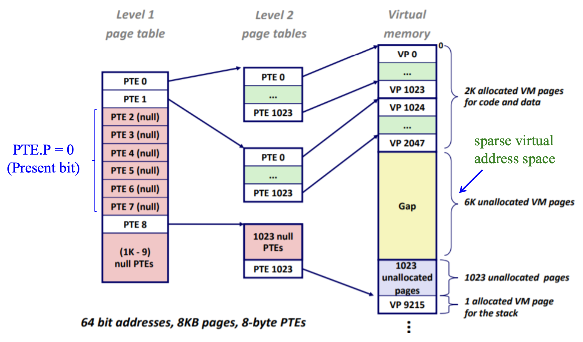 - 4 KB/page / 8 B/PTE = 2 9 entries -> 9 位用于寻址 PTE