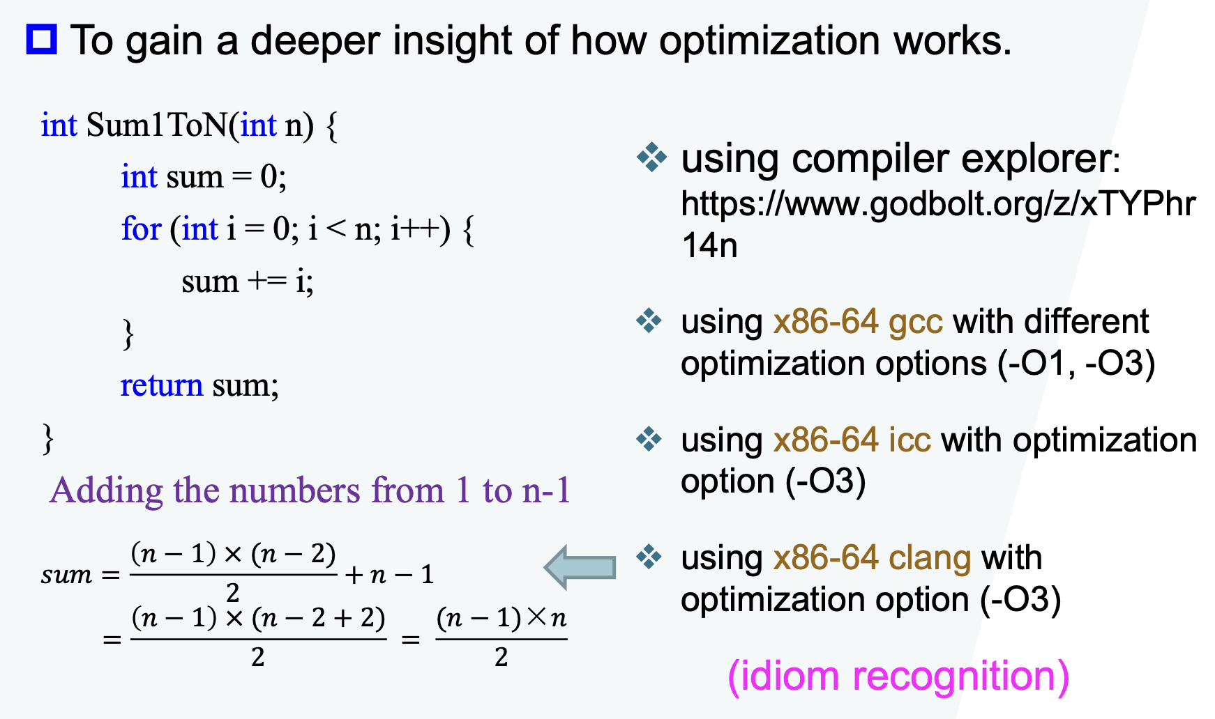进入上图所示链接(一个在线编译环境)后,尝试用右侧给出的编译器和优化选项进行编译,发现编译得到的汇编语言程序各不相同。