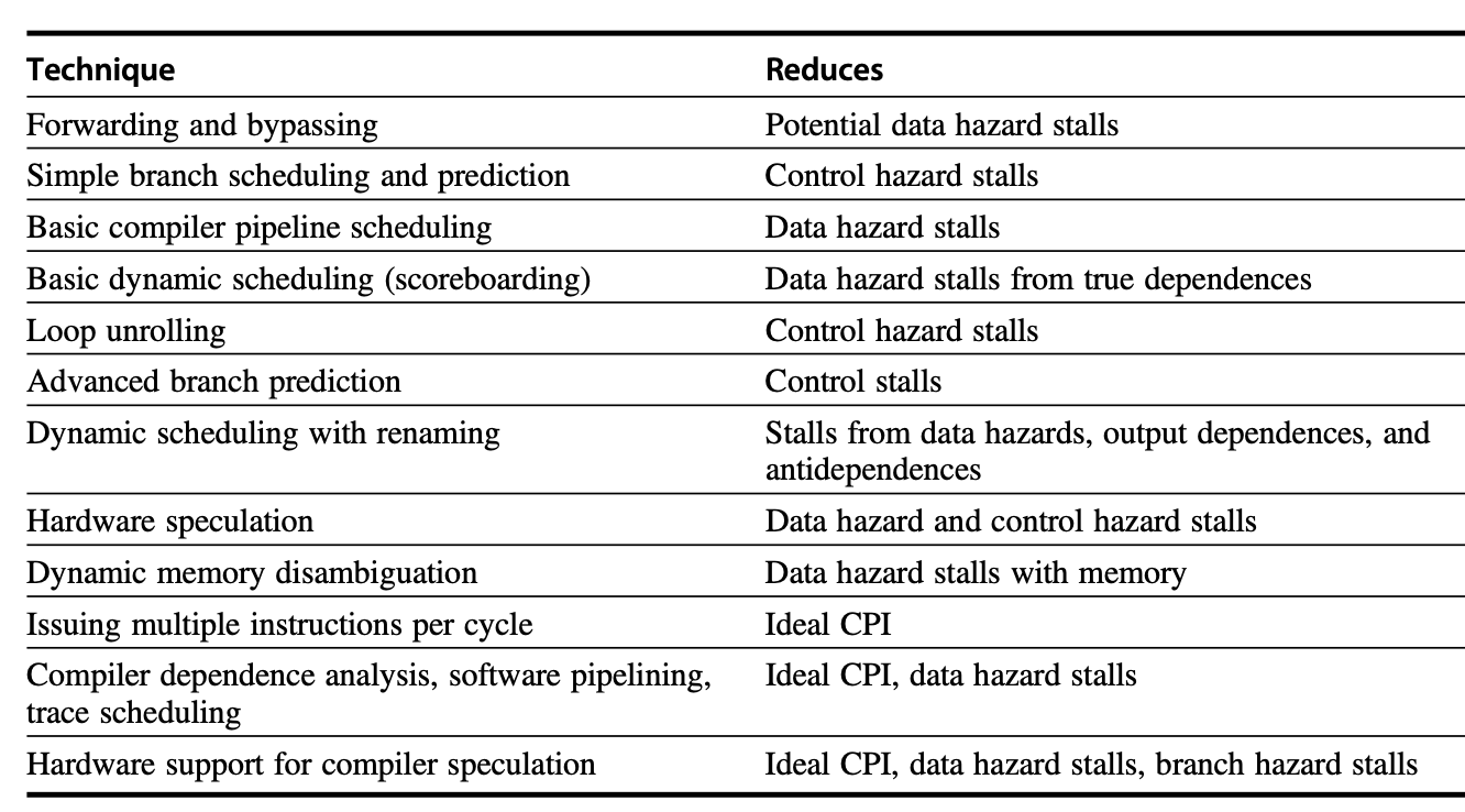 流水线 CPU 的 CPI 计算公式为:Pipeline CPI = Ideal pipeline CPI + Structural stalls + Data hazard stalls + Control stalls。其中等号右侧第一项理想流水线 CPI是对实现中最大性能的衡量。通过降低等号右侧的每一项,我们能够降低总的流水线 CPI。下表展示了所有能够影响到流水线 CPI 的工艺: