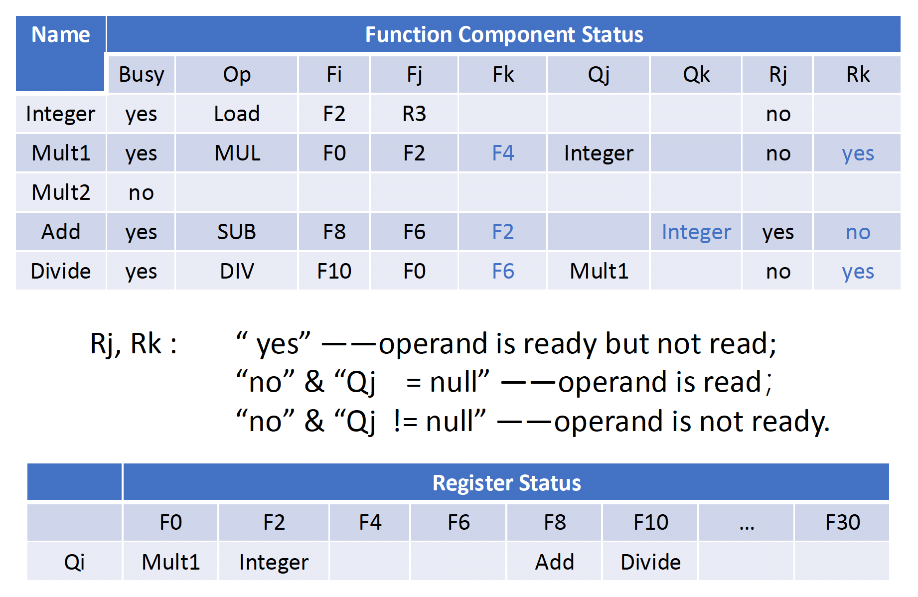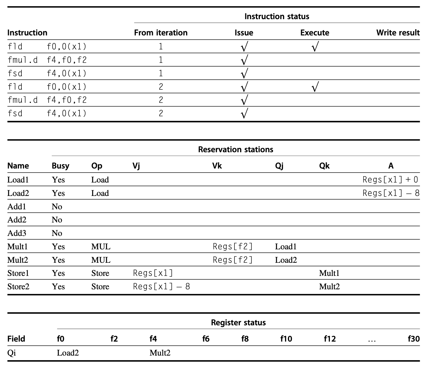 在指令发射的过程中,重命名进程会将架构寄存器的名称映射到物理寄存器的编号上,为其分配一个新的未使用的寄存器作为目标。通过该方法,WAW 和 WAR 冒险能够被避免,且推测恢复也能够被处理,因为保存指令目标的物理寄存器在指令提交前,尚未成为架构寄存器。重命名映射(renaming map) 是一种简单的数据结构,提供了与指定架构寄存器当前对应的物理寄存器编号,这是由托马苏洛算法中寄存器状态表执行的功能。