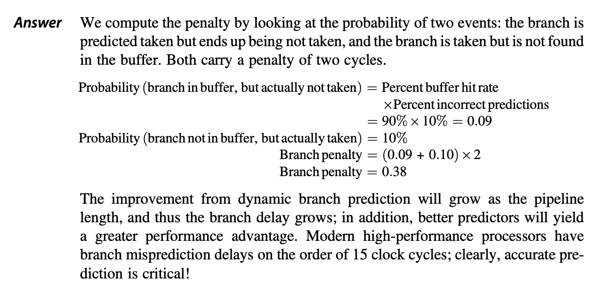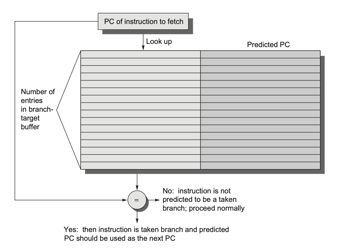 由于分支 - 目标缓冲区预测了下一条指令的地址,并且在译码指令前需要将其发送出去,因此我们必须知道取得的指令是否被预测为一个要跳转的分支。如果取得的指令的 PC 值和预测缓冲区的地址匹配上的话,那么对应的被预测的 PC 被用作下一个 PC。此外,我们仅需在分支 - 目标缓冲区内存储预测要跳转的分支就行了,因为不跳转的分支应该只获取下一条顺序指令就行了。
