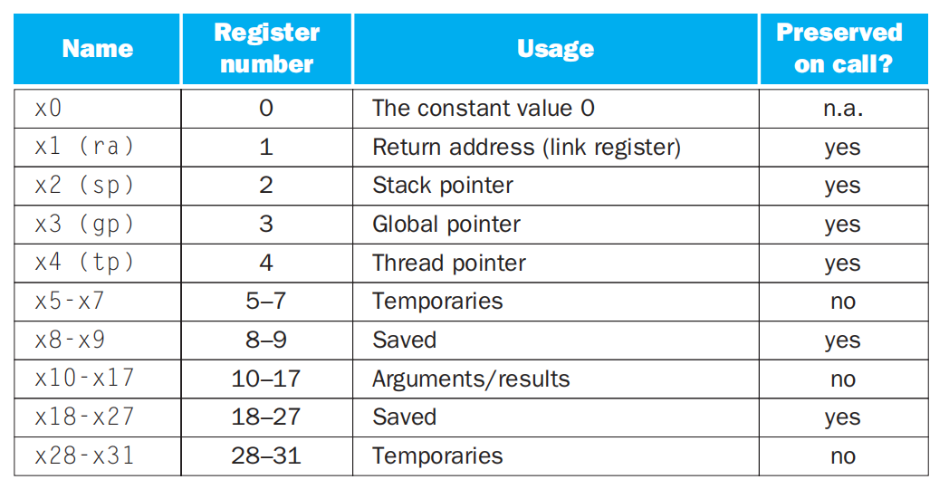 • 寄存器的命名规则:xn,其中n为整数,取值范围为0-31