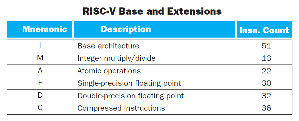 RISC-V 指令集被分为基础架构(base architecture) 和一些扩展(extensions),它们都是用单个英文字母命名的,如下所示: