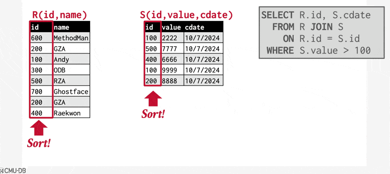- 为两个关系提供的元组在队列中排队等待处理;在 r, s 的所有元组生成后,插入队列的特殊条目(分别称为 \(End_r\) 和 \(End_s\))作为文件结束标记。