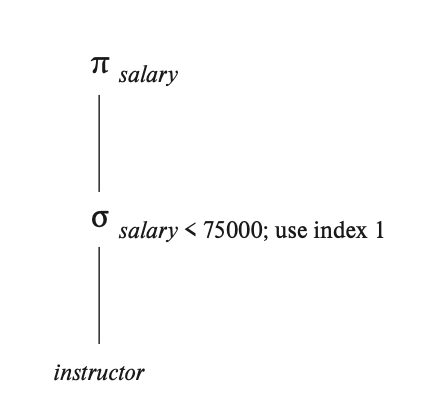 - 要对查询求值,除了提供关系代数表达式外,还要用一些指出如何执行求值操作的指令来进行标注 (annotate)(指出要用到的算法等等