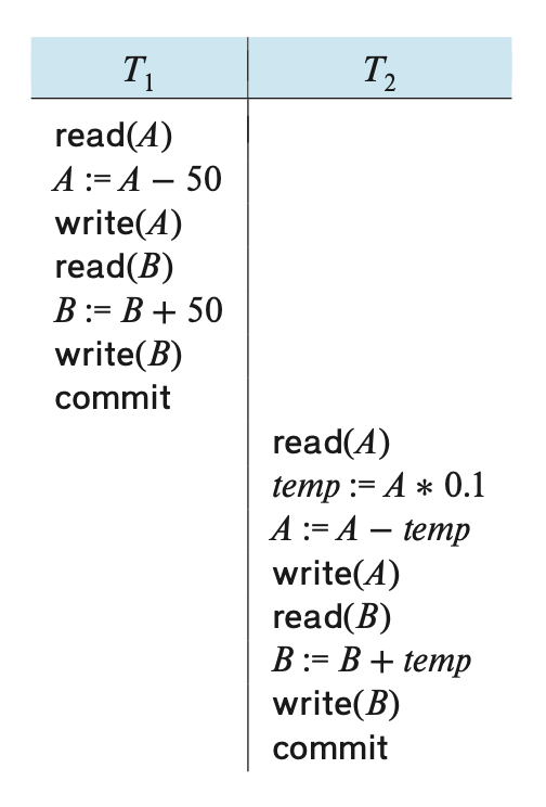 该调度得到的最终状态是不一致的,因为可以发现账户 A, B 的金额之和比原来的多出 $50。如果仅让操作系统控制并发执行的话,那么很多可能的调度都会出现不一致的状态。因此需要数据库系统来确保执行调度仍能保留数据库的一致状态。