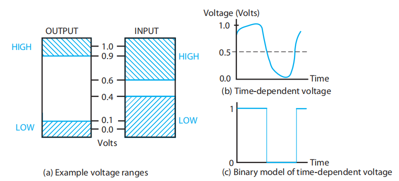 在现实世界中,信息变量由物理量表示;而在数字系统中,我们往往取这些变量的离散值——而二进制 (binary) 值是最流行的表示方法,它可以表示物理量的值或值的范围。它通常被表示为: