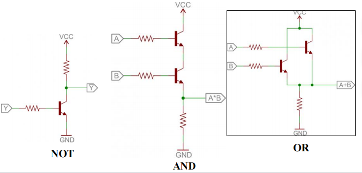 - 现在,晶体管 (transistors) 用来作为电子开关。逻辑门通过双极晶体管 (bi-polar junction transistors, BJT) 实现