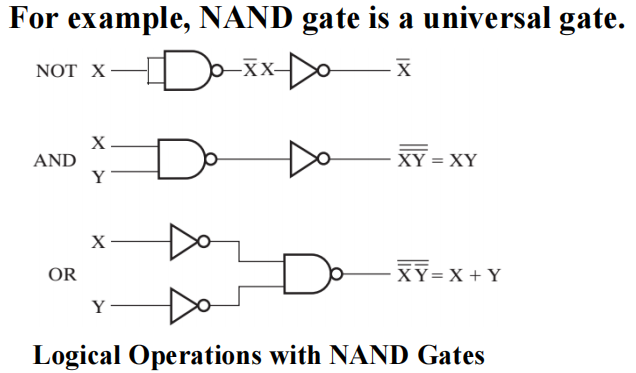 与非门、或非门都是一种通用门 (Universal gate),即可以用来执行任何布尔函数的门。通过 CMOS 技术很自然地实现与非门的功能。
