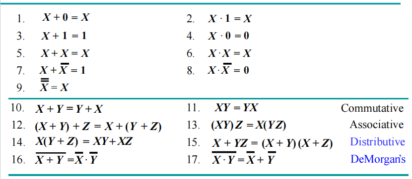 - 布尔函数和布尔方程,关于它们的一些恒等式,比如分配律、德摩根定理等