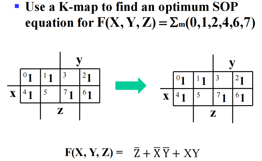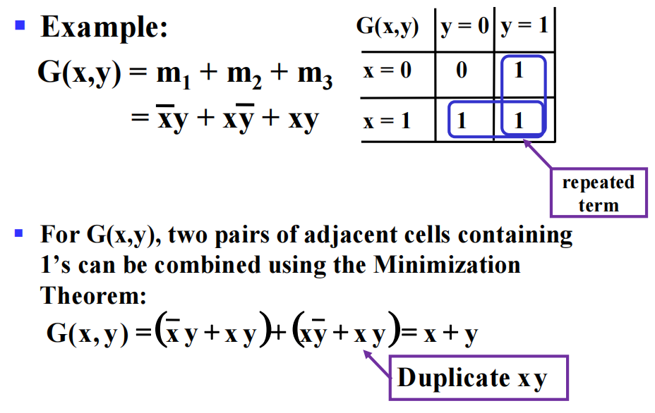 - 最小化:\(x \cdot y + \overline{x} \cdot y = y \quad (x + y)(\overline{x} + y) = y\)