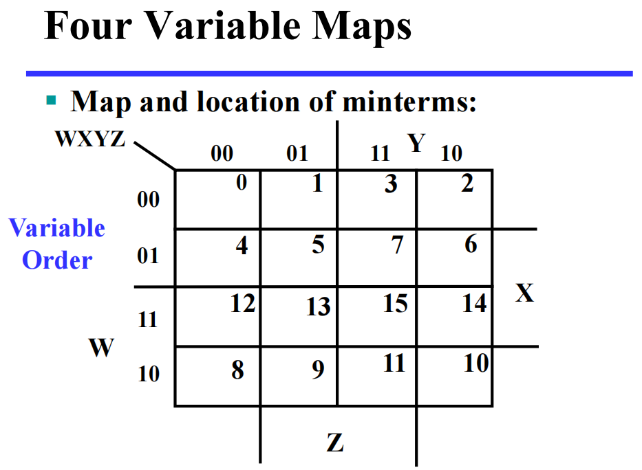 - 用最小 / 大项填充 K-map,其中最小项填 1,最大项填 0
