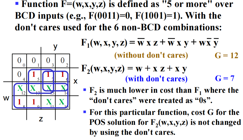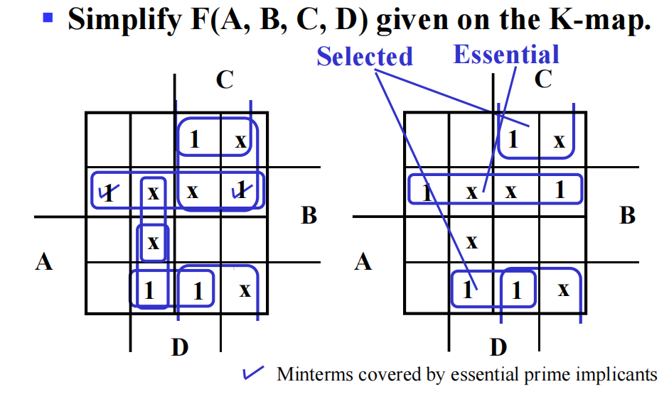 这样的输出值我们并不关心,因此用 \(\times\) 代表don't-Cares,既可以把它看作1,也可以把它看作0。在 SOP 化简中,我们可以把 \(\times\) 看作1,这样可以形成更大面积的主蕴含项,有助于化简,降低逻辑电路成本。