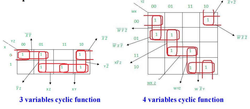 注:对于周期布尔函数 (cyclic Boolean function),它的 K-map 是没有质主蕴含项的