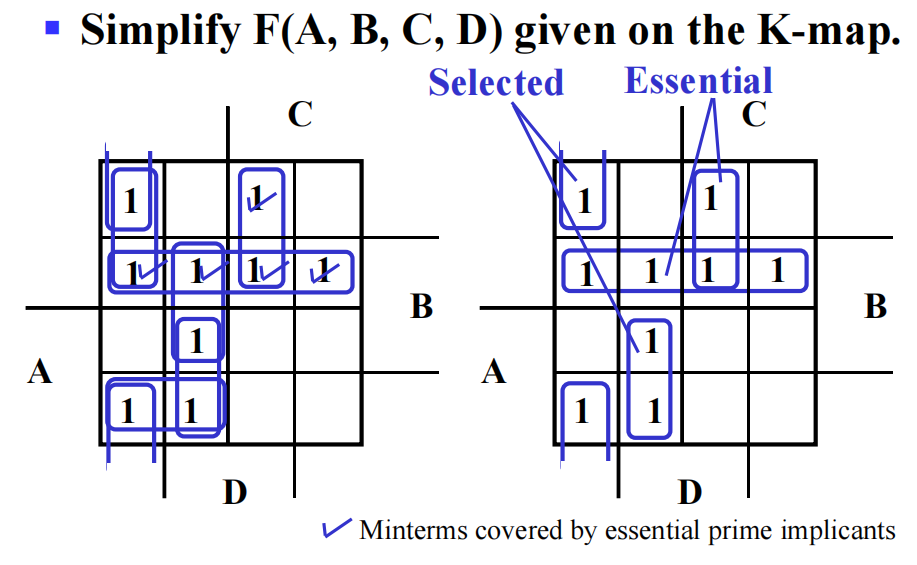 - 以 \(n\) 变量卡诺图为例,先找包含 \(2^{n - 1}\) 项的主蕴含项,再找包含 \(2^{n - 2}\) 项的主蕴含项,以此类推