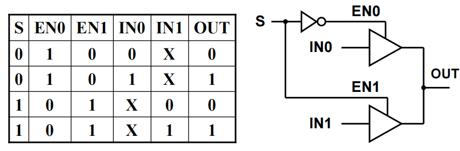 注:不难发现,当一个三态门处于使能状态时,另一个一定处于高阻抗状态,所以不用担心烧坏的情况发生 ( 实际上这是一个 2-1 MUX,Chap 3 会讲到 )