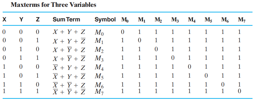 最大项 (maxterms) 是所有变量 ( 不论是本身 \(X\) 还是取补 \(\overline{X}\)) 的和项