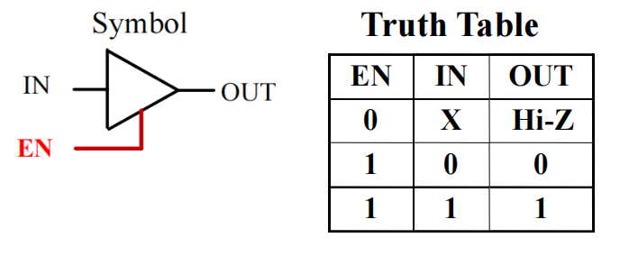 三态门 (3-state buffer) 提供了第三个逻辑值:高阻抗 (Hi-impedance) 输出Hi-Z,即输入和输出之间处于断路状态,因此高阻抗状态的门输出可以连在一起。