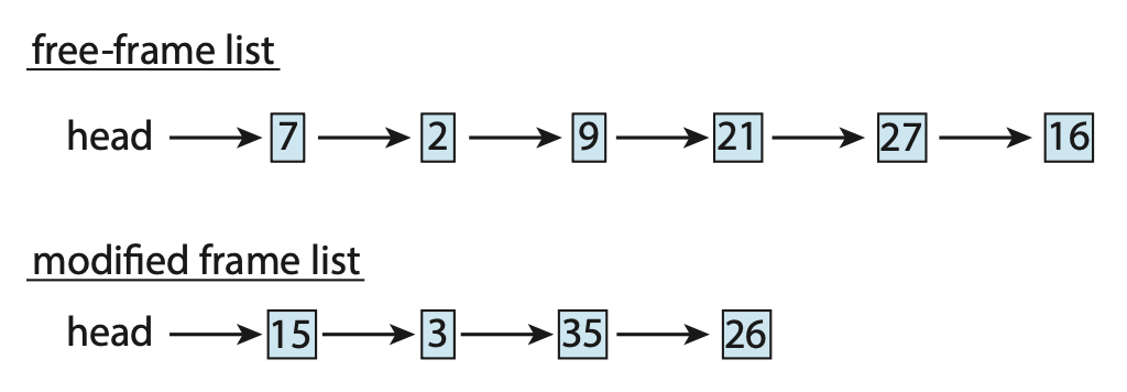 - 为解决页错误,OS 会维护一张空闲帧列表(free-frame list),存放所有空闲的帧(也会用在栈段和堆段的扩张中)