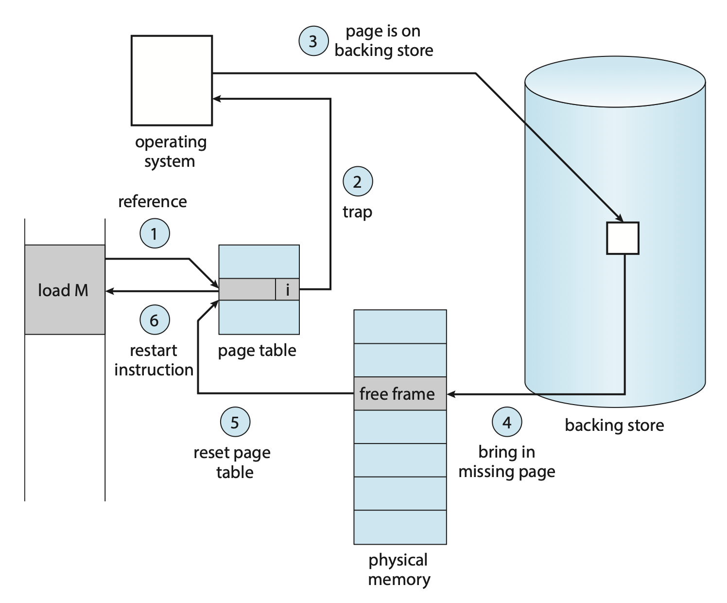 - 重新开始被陷阱中断的指令,现在进程可以访问所需页(就好像这个页一直在内存中)