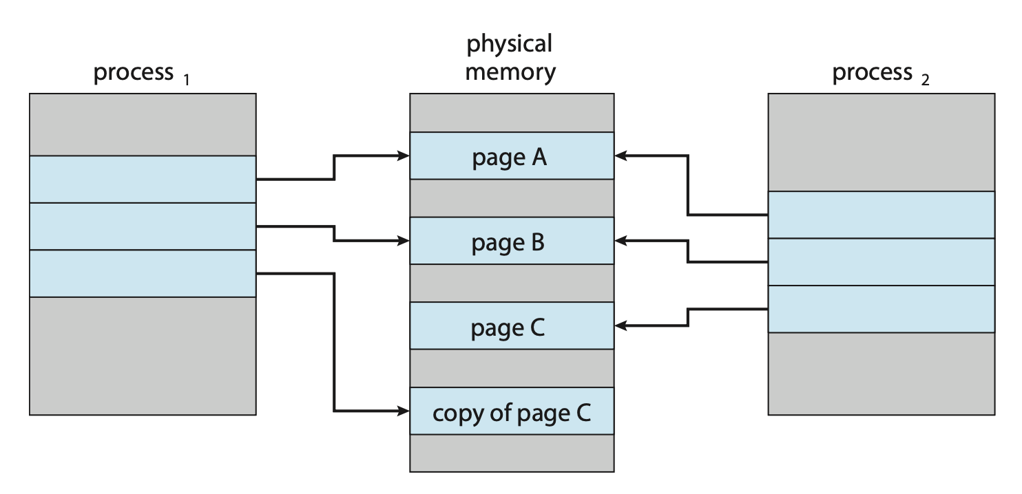 使用 fork() 系统调用的进程创建一开始可能通过使用类似于页共享的技术来绕过按需分页的需要。该技术提供了快速的进程创建,并且最小化必须分配给新进程的页数。这种技术就叫做写时复制(copy-on-write),能让父进程和子进程共享相同的页。这些共享的,且需要修改的页被标记为写时复制页;进程向这种页写入时创建这个共享页的拷贝,写操作仅发生这个拷贝上。这一过程如下所示: